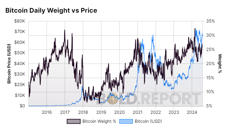 And finally, since the 2017 all-time high, when the Bitcoin weight was 18.6%.