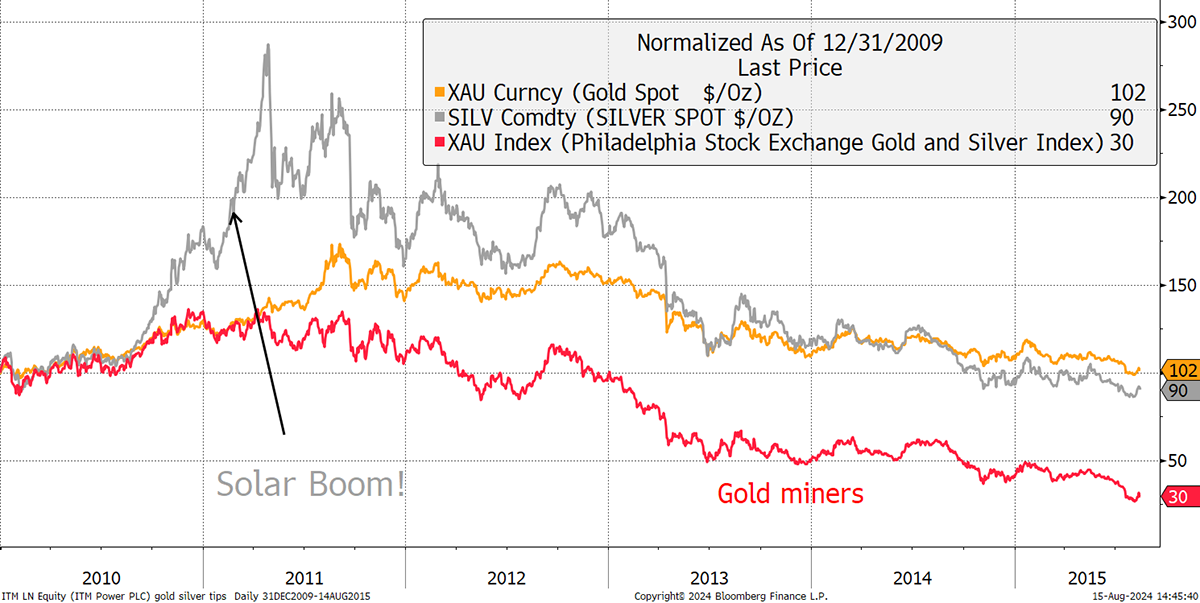 This reminds me of the silver rally of 2010, which saw the price surge to $50 on the back of demand for solar panels. The slump that followed was weighed down not only by a weak gold market but also by substitution, something that has killed many commodity rallies.