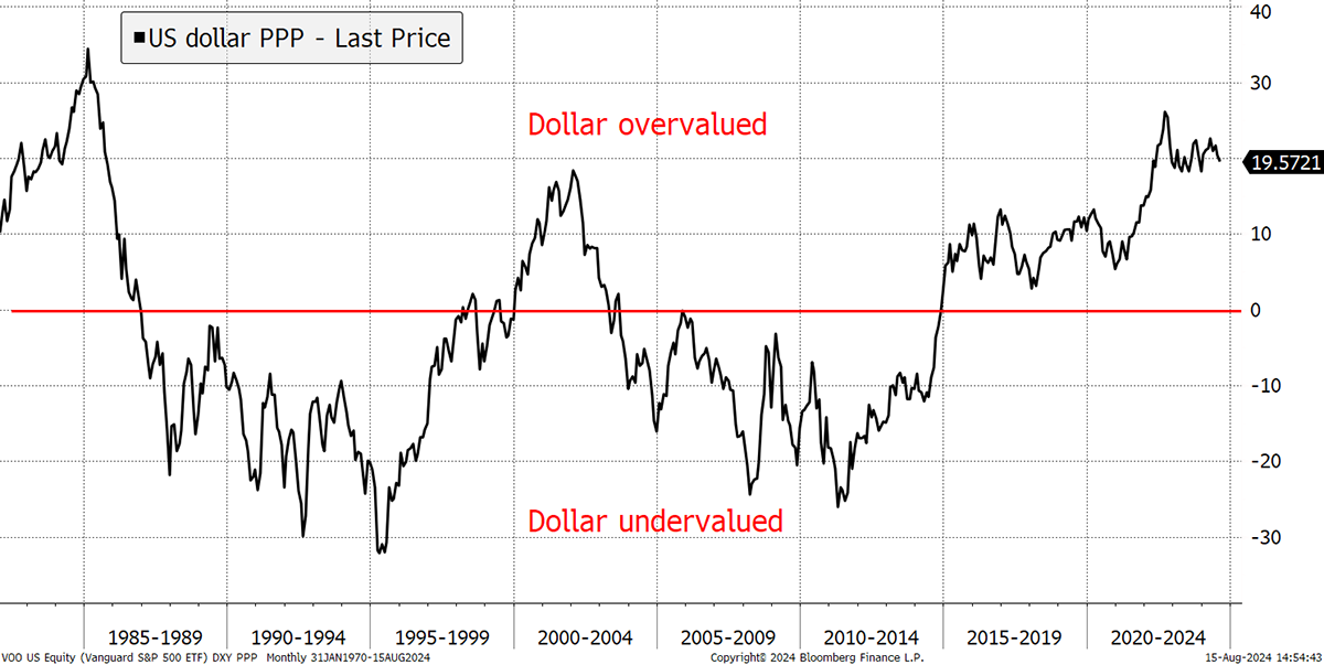 The dollar is soft because the US has high debt and deficits, and they are not alone. But they are the biggest, and the dollar is super expensive on a purchasing power basis. A sustained dollar bear is going to happen, but when?