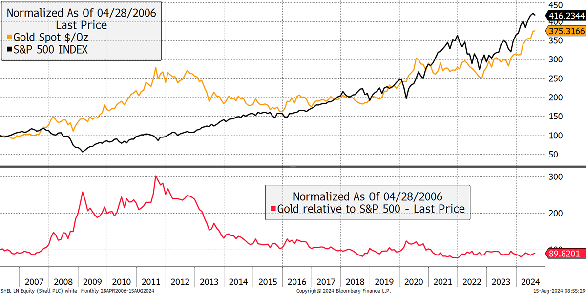 Starting from the new era in 2006, gold has lagged the S&P 500, but not by much (dividends excluded), as shown in red. It is remarkable how these two assets work against each other, distinctly demonstrating the natural power of gold as a portfolio diversifier. It’s clear to the naked eye.