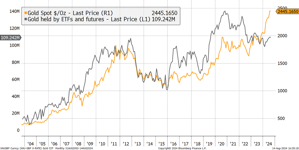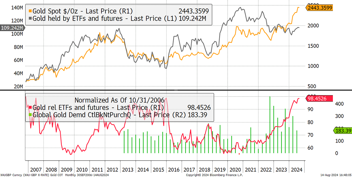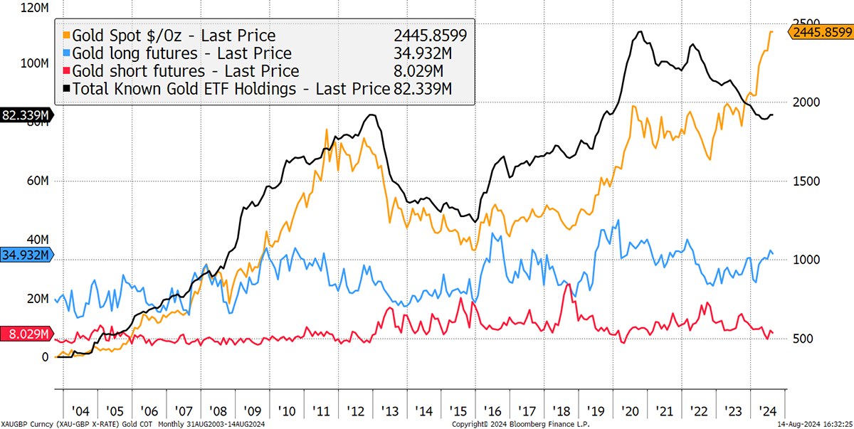 More recently, this has been repeated. Low positioning reflects a weak trend as seen in 2022. As the trend improves in 2023/4, the funds increase their exposure to gold.
