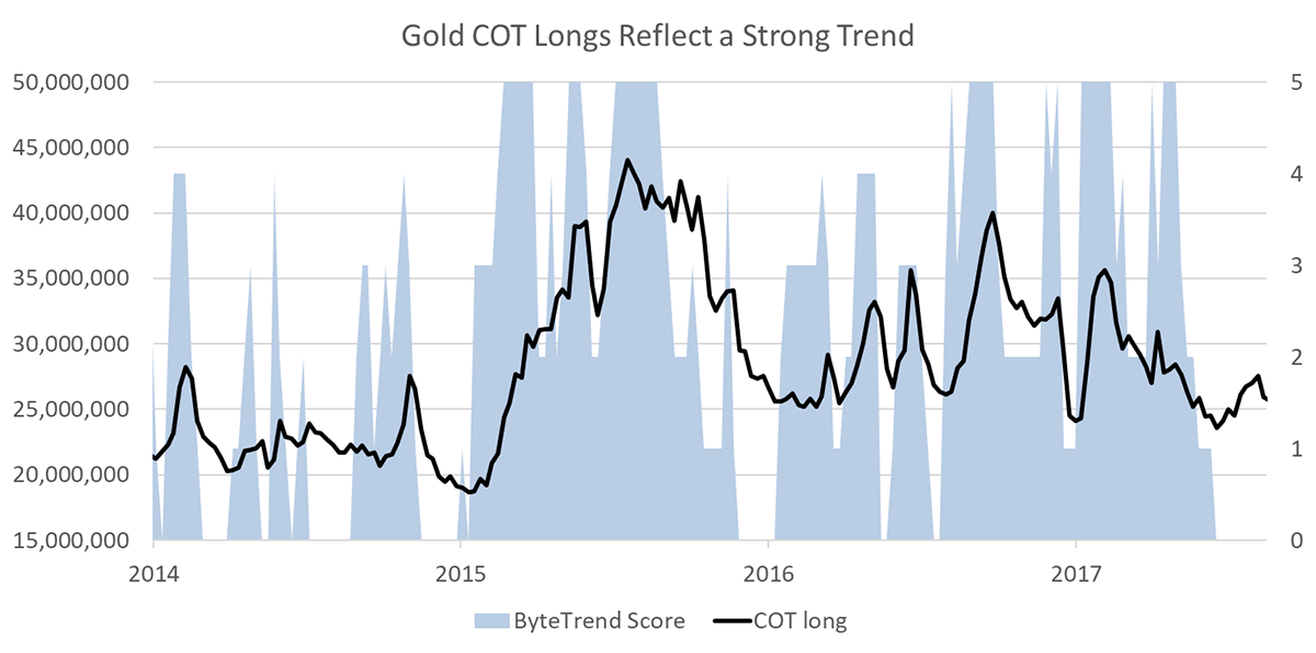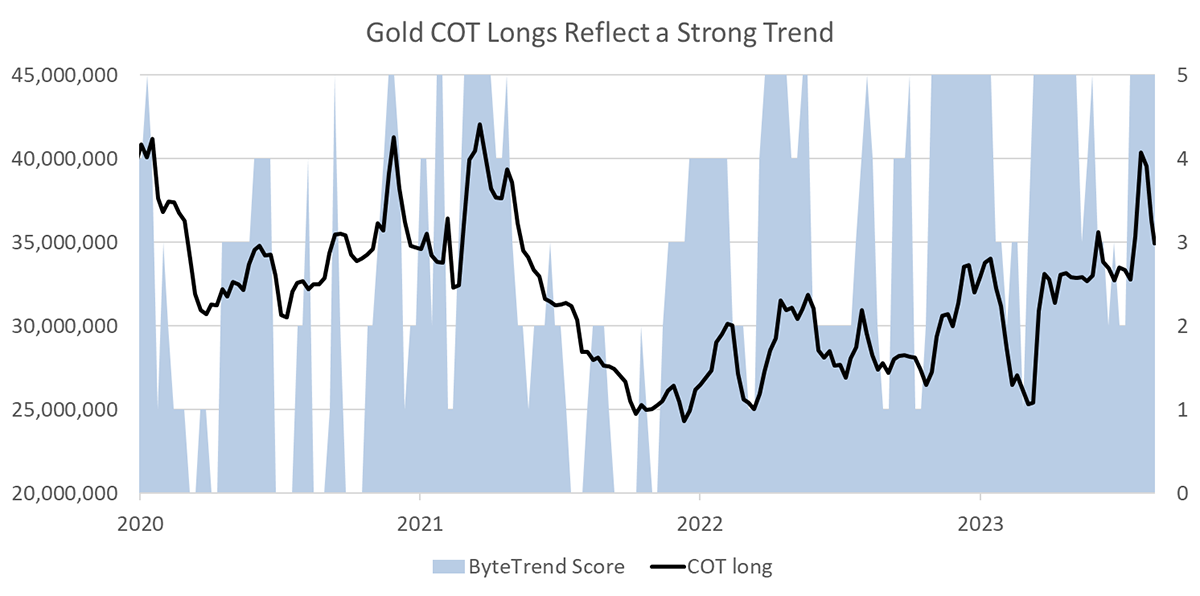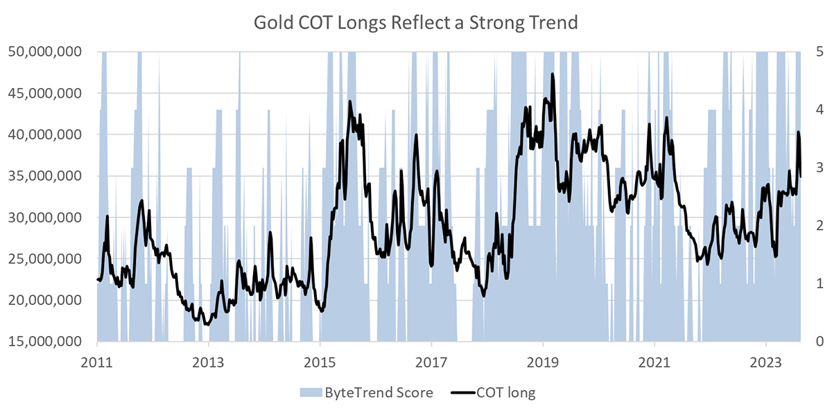 I can demonstrate this by overlaying our trend score from ByteTrend.io over the COT longs. A score of 5 reflects a good chart that is going up, and a 0, a bad chart going down. It is pretty clear that the COT data follows the trend scores and lags behind.