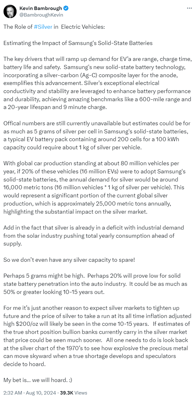 Kevin Bambrough (X handle @BambroughKevin) cited a piece on Samsung’s new solid-state battery, which enables a car to drive 600 miles on a single charge. The batteries have a 20-year life, and charge in nine minutes. Best of all, they require silver and plenty of it.
