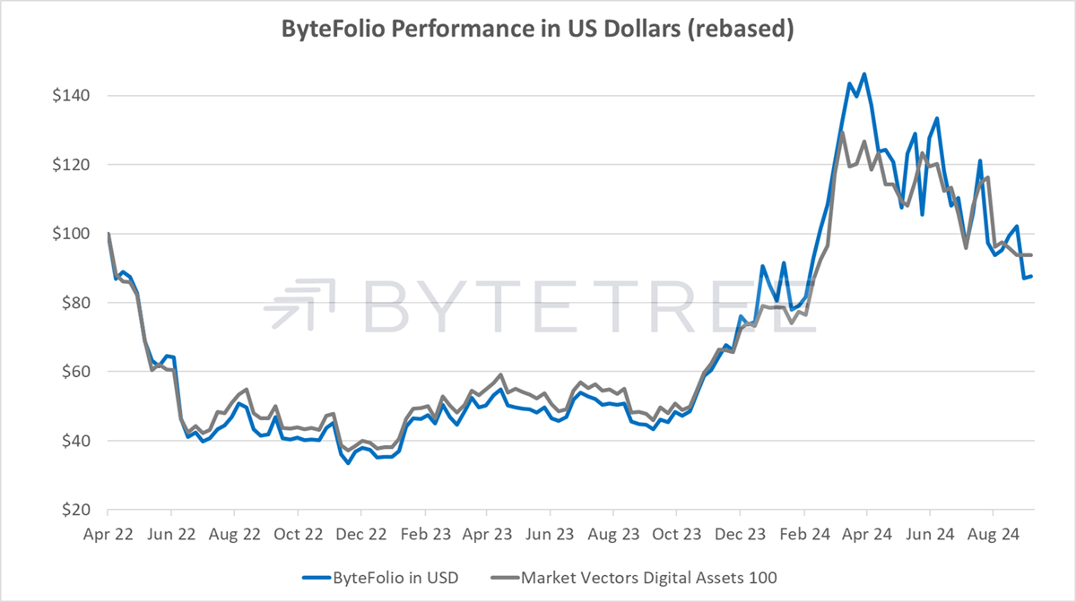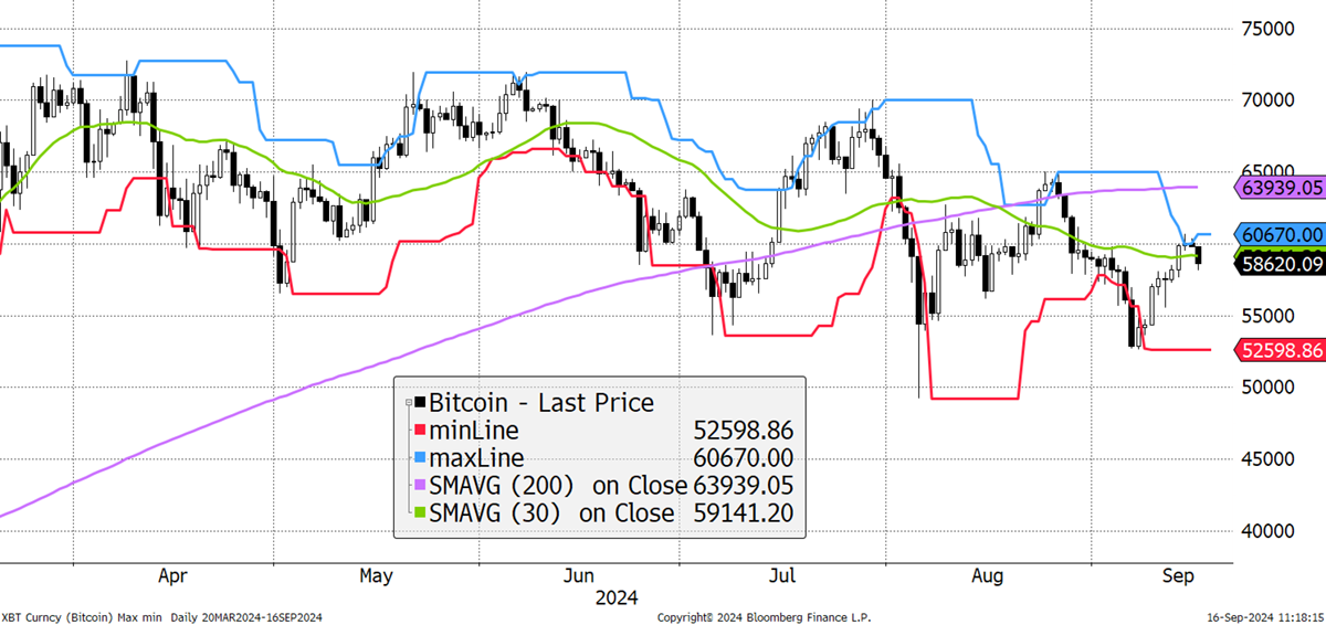 The recent Bitcoin low was above the August low, which is positive. The price made a 20-day high and is back above its 30-day moving average, which is rising. A couple of good days would see the ByteTrend score of 4/5 improve. Bitcoin to be weak in September is not unusual, and the seasonal strength that historically begins in October is just two weeks away.