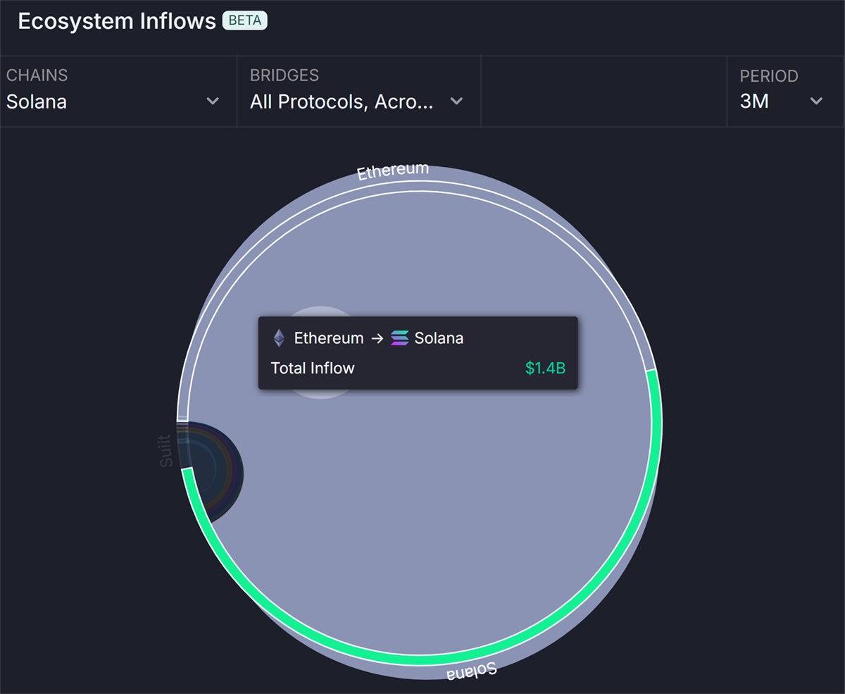In the last 3 months, Solana has gained $1.56bn in liquidity and lost $503m, bringing the net flow to over $1bn. Of the total gain in liquidity, $1.4bn or 90% derived from Ethereum, as shown below.
