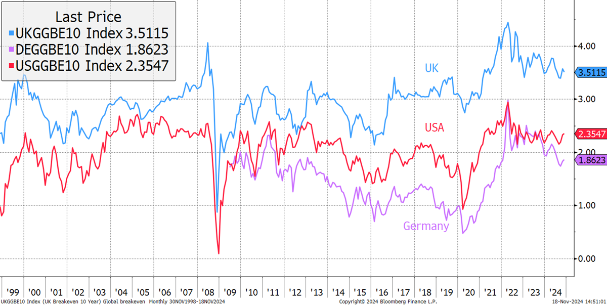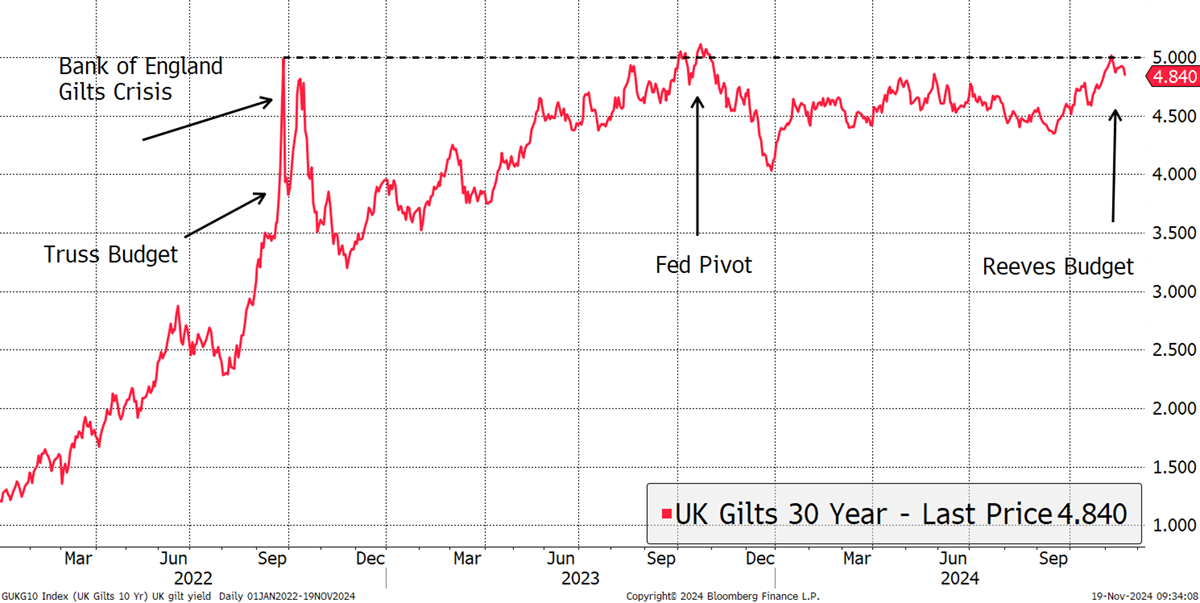 The Truss/Kwarteng Budget, which the Bank of England later admitted the associated gilt moves were two-thirds their fault, peaked at a 5% yield. That level was challenged again the following year as interest rates had been expected to keep rising, but they didn’t. The central bank rhetoric then changed as they deemed the battle against inflation to have been won, at least over the medium term. Then, recently, we had a high-spending UK budget and a Trump landslide victory, and the reaction from gilts was more restrained than it might have been.