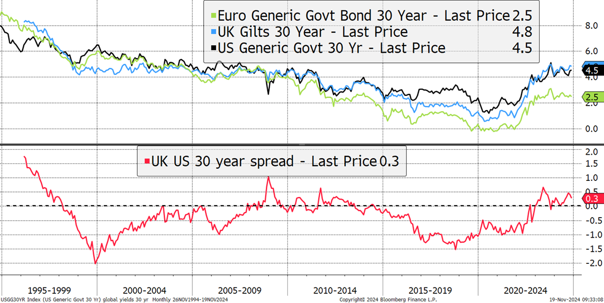 The long gilt is telling us that high-spending governments will be funded and that inflation is under control. Looking at Europe and the US, that message is reiterated, with US and UK 30-year yields moving in step, as they have for much of the past three decades. European yields are lower, implying an even worse outlook for growth than in the US or UK. The UK-US yield spread (the difference) has been widening after the budget, but not materially. In summary, the Reeves budget may have peeved us, but it hasn’t broken the gilt market.