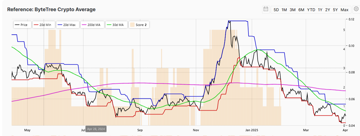 Outside Bitcoin, the crypto space remains weak. Our market breadth indicator, the ByteTree Crypto Average (BCA), is in a terrible state, on a ByteTrend Score of zero.