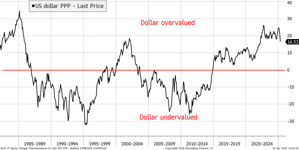 The point about the dollar is important because Trump wants it lower to adjust the US terms of trade. By my calculations, the cost of living is 16% above the rest of the developed world, having been 27% in the recent past. We have seen dollar-falls before, and this overvaluation is the primary reason I have been so reluctant to embrace US equities since late 2020.
