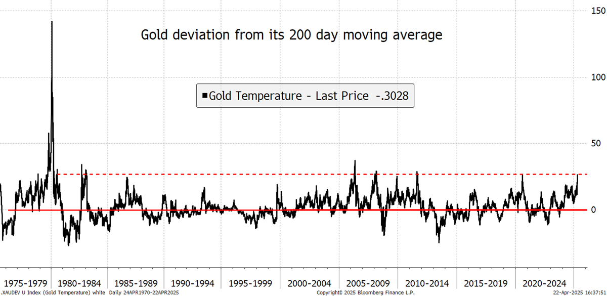 The price of gold in USD is now 26% above its 200-day moving average. That is high and is extended from the trend and, therefore, overbought. It matches the levels seen in mid-2020 and late 2011, which led to lasting corrections. That said, it also reached this level in 2006 and 2008, which saw short corrections. I can’t ignore the fact that it was 140% above trend in 1980, and we may see that again one day, but we don’t know when that might happen.