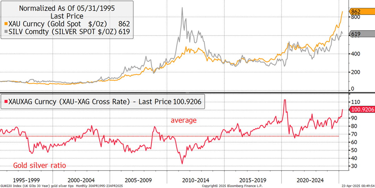 The gold mining stocks have been acting well and, while not yet getting in front of the gold price, are certainly keeping up. Gold and silver have delivered similar returns over many years, but this cycle, silver has lagged behind. The good news (or bad news) here is that the gold-to-silver ratio recently touched 105 (not shown on the red monthly chart), which is similar to the divergence during the pandemic. What happened next? Silver doubled within weeks. There is no reason this shouldn’t be repeated. That’s not a hard prediction, but a precedent.