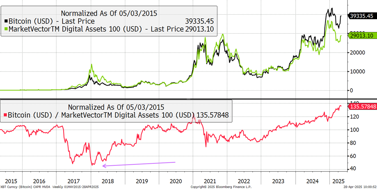 But however you look at it, Bitcoin is stronger than crypto, and by a wide margin. In ten years, Bitcoin has beaten the MVDA 100, which included Bitcoin as its largest constituent, by 35%. Consider that Bitcoin鈥檚 low point was in late 2017 when, although the price was $19,000+, it had underperformed the crypto sector. Since that time, Bitcoin has been over three times stronger, outperforming the pack by 15% per annum. That鈥檚 a huge gap.