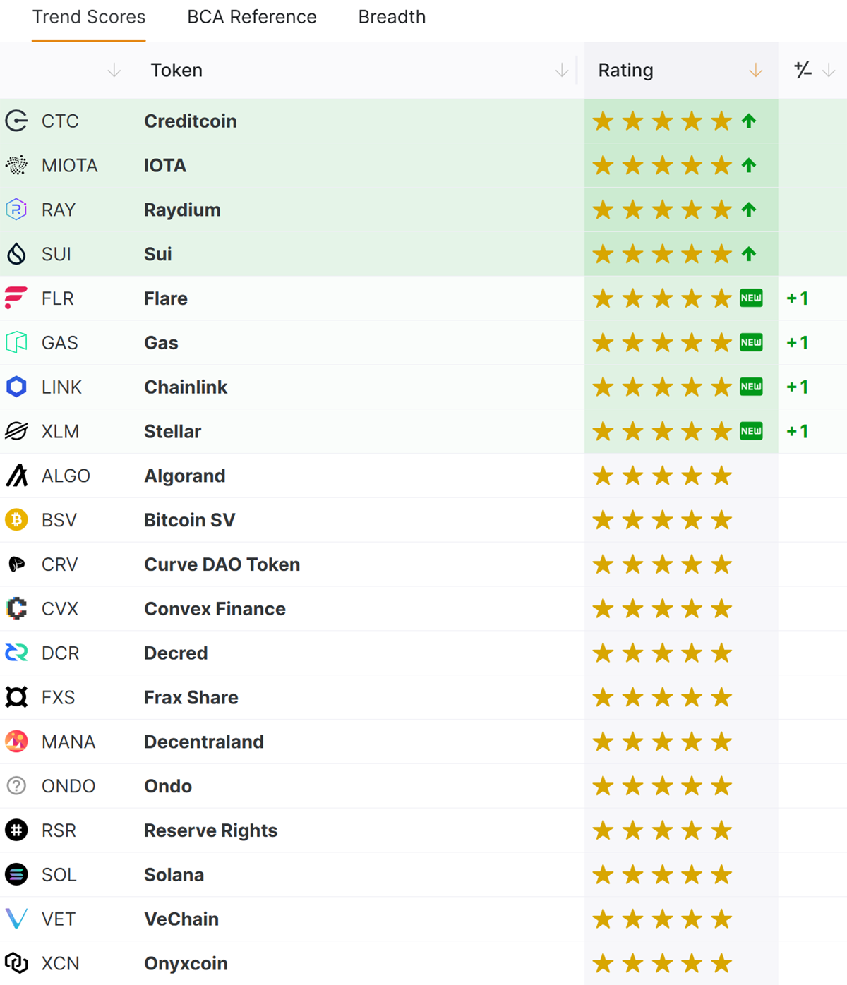 Given that we have recently started a new rally in the sector, there is a chance that altcoins fight back. To get a more top-down view, we look to the ByteTrend Crypto Average (BCA), which measures the average daily price move of the top 100 crypto tokens in USD, highlighting the outperformers (5-star trends) and underperformers (0-star trends). The current leaders, when measured in BCA, are shown. This week, Ali will shine a light on his favourites.