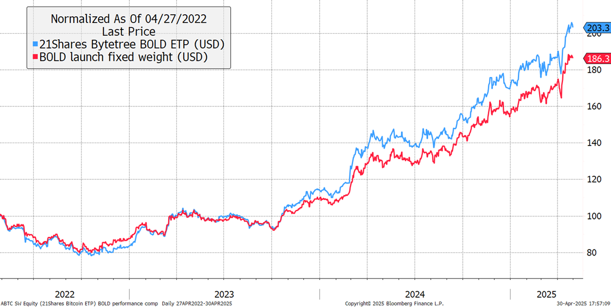 Each month, the volatility sets the asset allocation and then rebalances the portfolio by buying low and selling high. After 36 rebalances, you can see that the 21Shares ByteTree BOLD ETP (blue) rose by 103.3%, whereas a zero-fee portfolio of Bitcoin and Gold, using the same start weights, lagged by 17% or 5.5% p.a. The fees, a mere 0.65%, were clearly worth it as they added 5.5% of value each year.