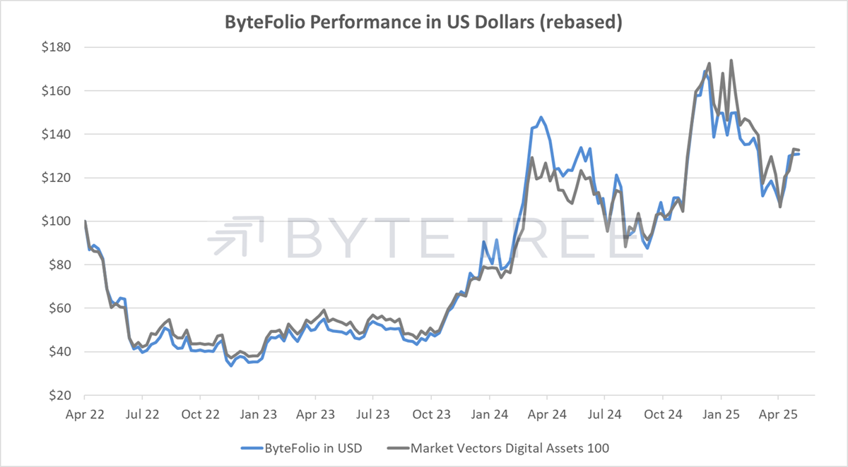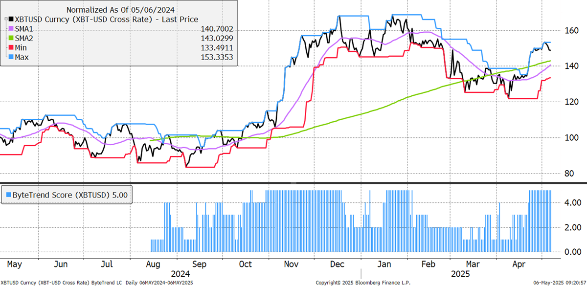 There鈥檚 been a modest pullback, but it's still an uptrend for Bitcoin. This chart is rebased to 100, which shows the performance compared to the start date. The bullish point is that the 120 level ($80k price equivalent) is likely to be a major low. The 30-day moving average will soon cut through the 200-day moving average, which will be a boost for the bulls.
