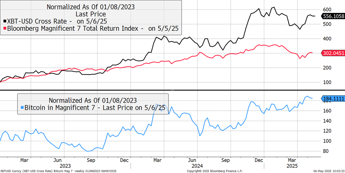 Since the start of the latest bull run at the beginning of 2023, Bitcoin has done nearly twice as well as the Magnificent 7 stocks. Now, they have come under pressure, and the hope is that the big money will buy Bitcoin, and to some extent, they are.