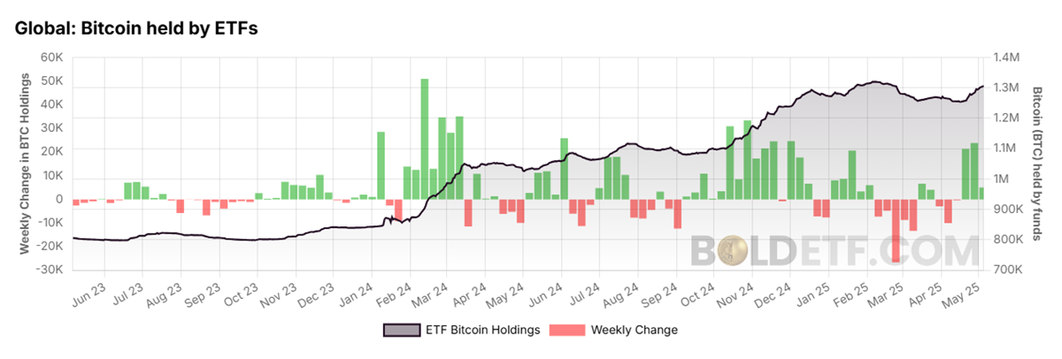 The number of Bitcoins held by ETFs has been rising again after two strong weeks and is not far from a new all-time high. Add in Saylor鈥檚 Strategy and copycats, and there is a strong bid for Bitcoin.