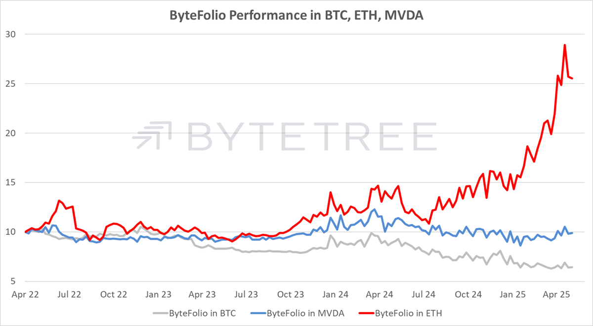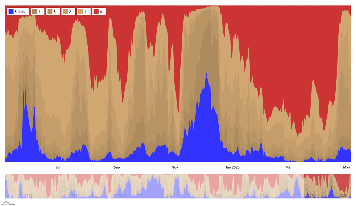 The only negative is the poor performance of altcoins compared to Bitcoin. The ByteTrend breadth chart in USD shows that very few alts are now in 0-star downtrends (red has shrunk), but there is still a lack of blue 5-star bullish trends.