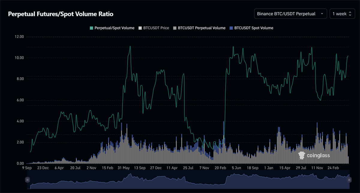 A similar pattern exists in crypto, where perpetual futures dominate spot trading volumes. Nowhere is this more evident than with Bitcoin, the most traded crypto asset. On Binance, for example, Bitcoin’s perpetual futures trading volume regularly exceeds 10x the spot volume. This is not a temporary distortion; it’s a structural trend that has only grown stronger over time, with the perpetual-to-spot volume ratio highlighting the shift.