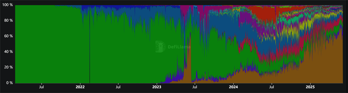 That vision resonated, and Hyperliquid began capturing market share in 2023, growing into a market leader in the decentralised perpetuals space. At its peak, the protocol held over 72% of the total DEX perp market share, as highlighted below in brown.