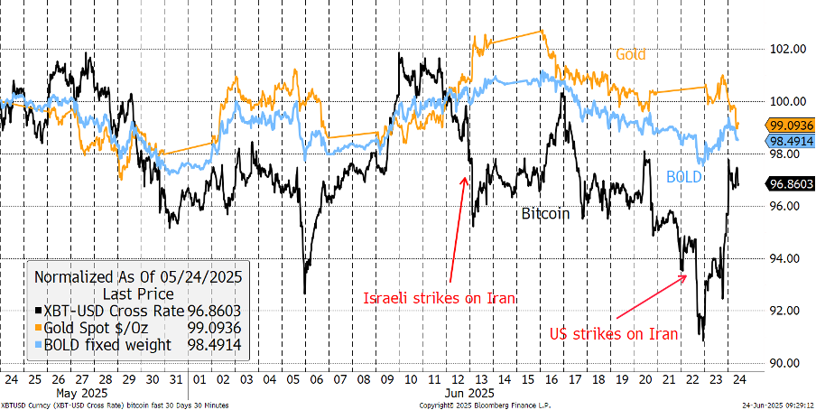 The weekend saw military action in the Middle East on a grand scale, and by Monday financial markets had shrugged it off. The targets were nuclear facilities and not oil, and the Straits of Hormuz would remain open. Gold eased back, the US dollar rally fizzled out, and as we are becoming used to, the bond market barely reacted. The oil price quickly retreated from $80 back to $69, which is the level seen two weeks ago.