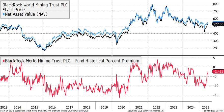 Good news came from the Blackrock World Minding Trust held in Soda. Although it holds many of the diversified miners, with Glencore the largest holding, it also holds gold, silver and copper stocks. What’s notable is how this diversified approach has worked quite well, in a volatile market, and the discount (red) has practically closed. This means the trust share price has rallied back towards fair value, implying increased demand for mining stocks. This is a positive development, and a good omen for the sector.