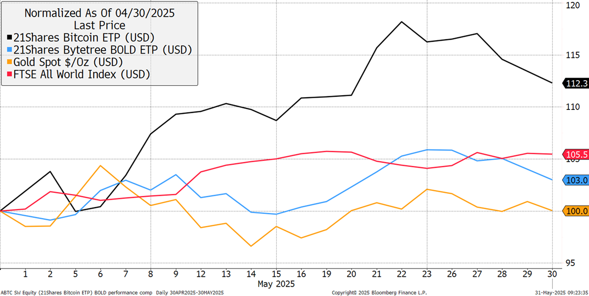 In May, BOLD rose by 3.0%, Bitcoin rose by 12.3%, and Gold was flat, while global equities rose by 5.5% in USD terms. The US dollar was down 0.1%.