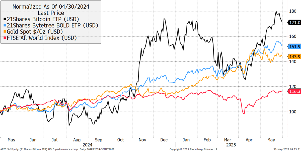 Bitcoin, Gold, BOLD, and Equities in USD – May 2025