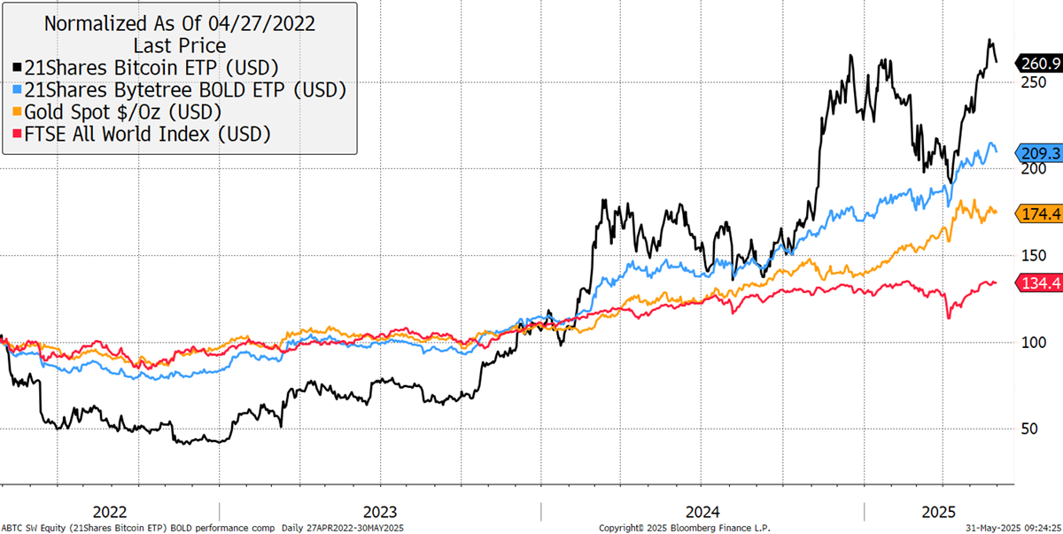 Since the 21Shares ByteTree BOLD ETP’s inception on 27th April 2022, BOLD has returned +103.3%, Bitcoin has returned +160.9%, Gold is up +74.4%, while equities have risen by +34.4%.