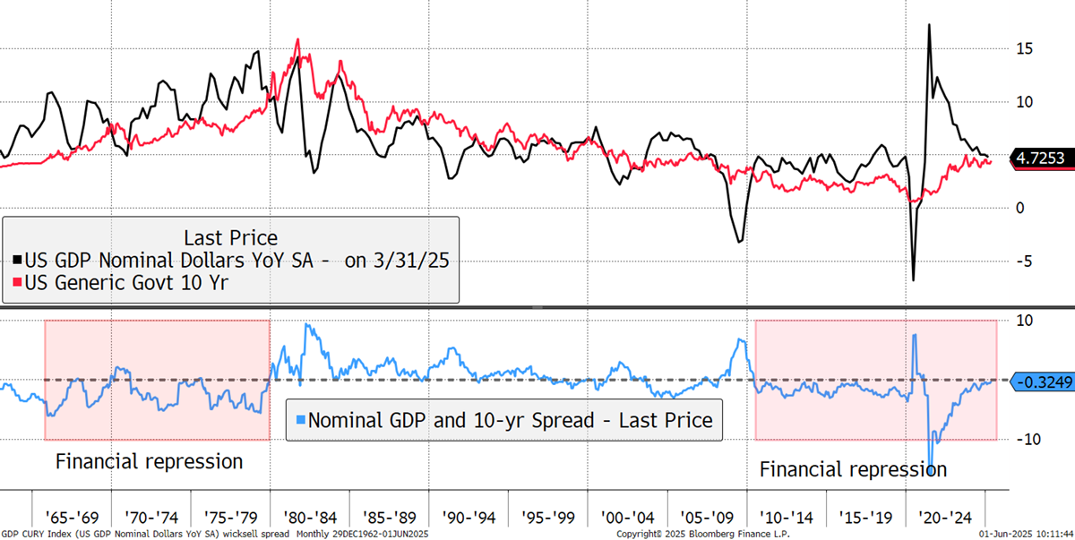 The US administration is trying to boost the real growth part of nominal growth and contain inflation to try and restore financial repression. This is the only way to reduce the debt burden in the long term.