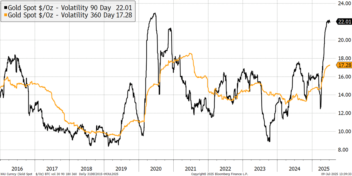 Contrast that with gold鈥檚 volatility using the same measure. Long and short-term volatility is rising, which implies higher risk ahead. It doesn鈥檛 mean the bull is over, but it is certainly riskier than it was.
