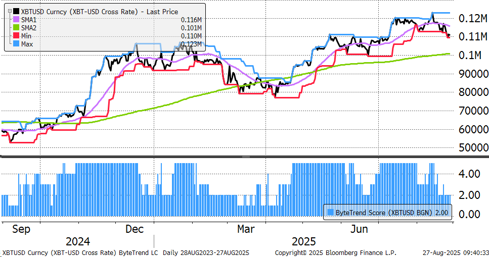 Bitcoin drops to a ByteTrend Score of 2 in USD. That means the price has touched the 20-day low (red), has turned below the 30-day moving average (pink), and that same moving average is pointing down. This has stalled the rally, but at least there is plenty of support at the $100k level. A retest is possible, but a break would be disappointing.