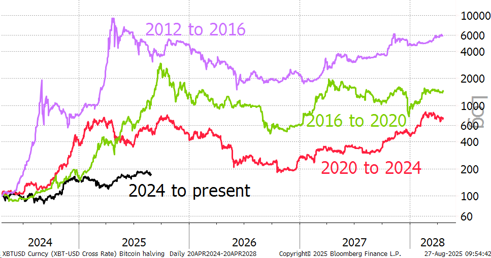 It has certainly been a slow post-halving cycle compared to the past, but it is notable how the last cycle (red) performed very well in the run-up to April 2024, with an 8x gain. Maybe this cycle, if there still is such a thing, came early. But you can’t ignore the fact that $2 trillion + assets behave differently than when they were minnows.