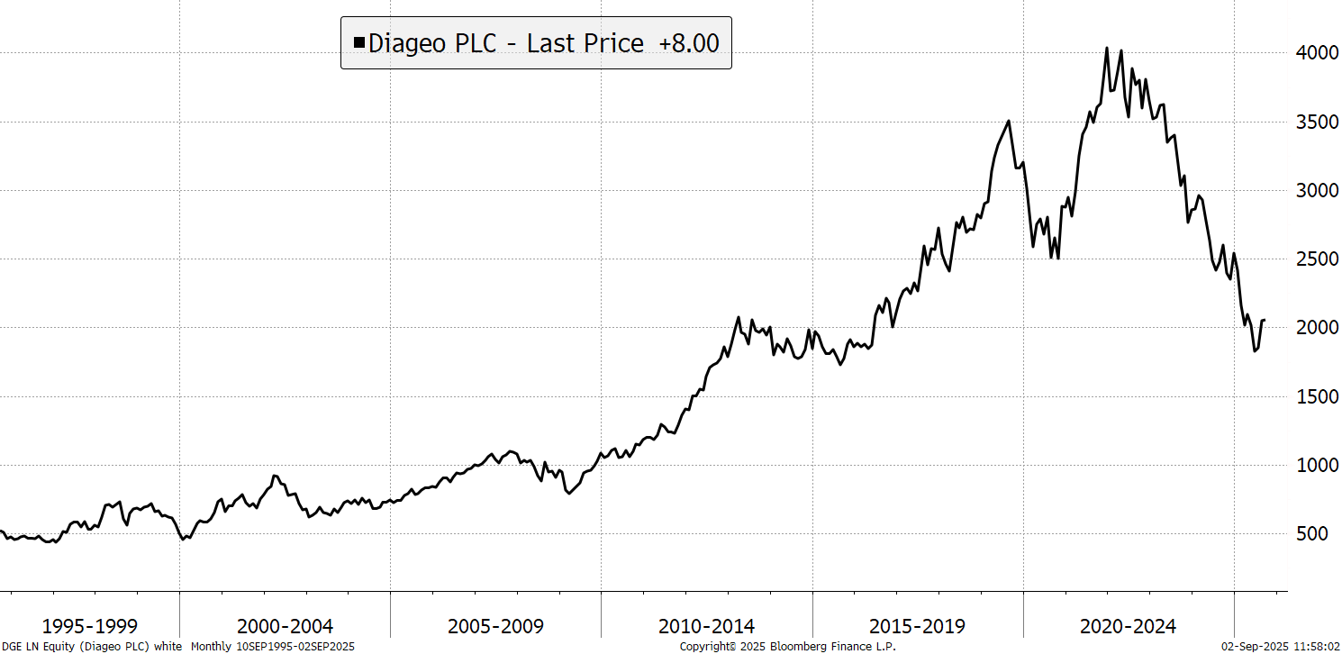 Finally, a global recession, or bear market, would clearly affect Diageo. US stock market valuations and concentration are at extreme levels, and this is a risk. However, we would expect true quality stocks to see more stable demand, and we take comfort in the fact that Diageo has already halved its valuation, and taken actions to improve the business.