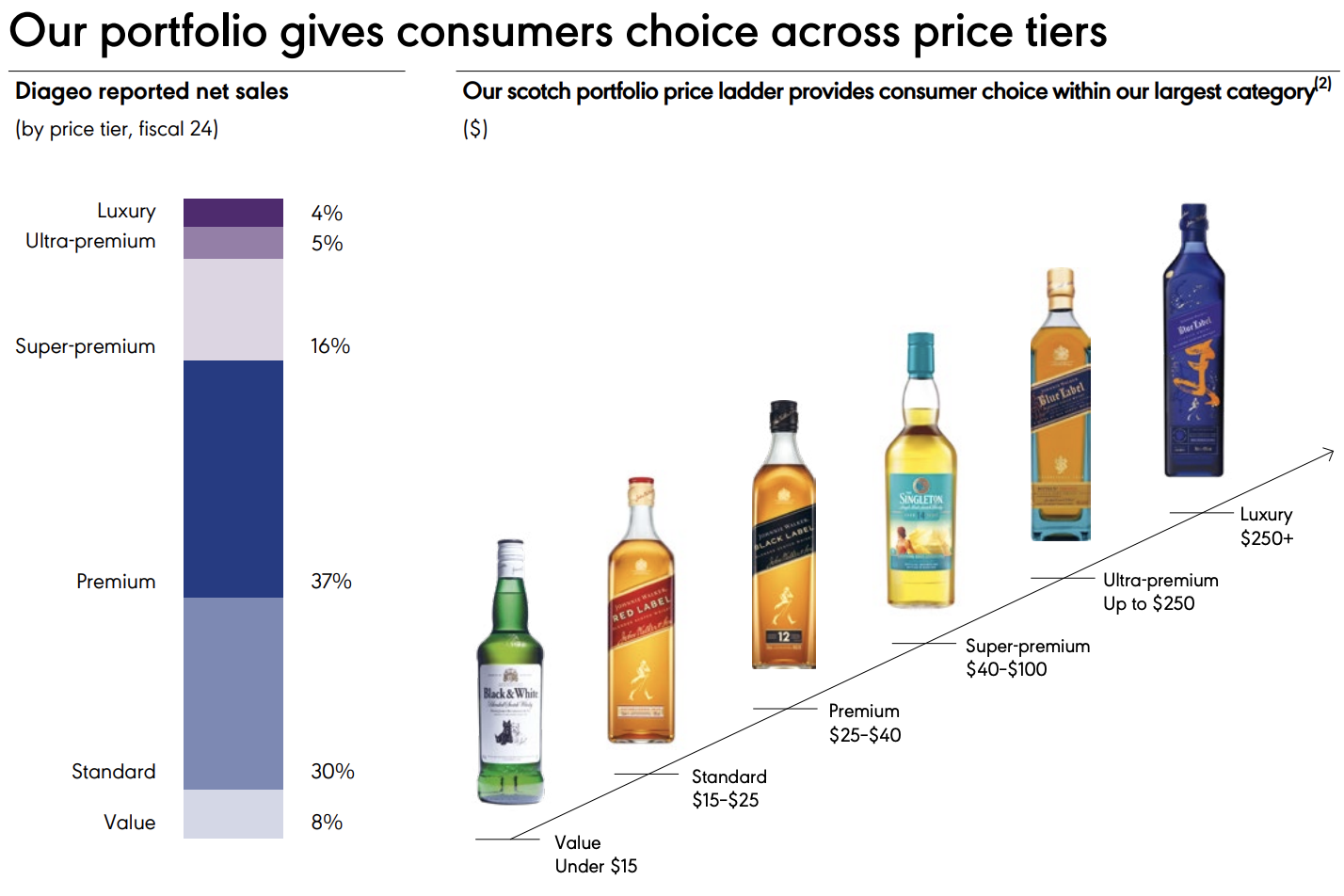 Diageo skews premium with its spirits, but retains exposure along the price curve. It continues to innovate, and current priorities are focused on non-alcoholic alternatives as drinking trends shift.