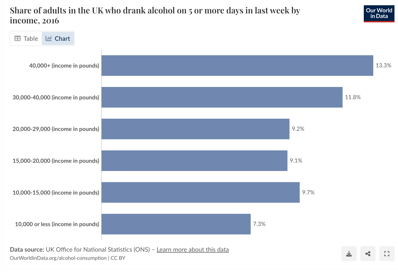 The Diageo leadership have repeated the mantra that an additional 500 million legal-age purchasers will enter the alcohol market in the next five years, driven by ageing, population growth and economic development. The percentage of adults who drink differs by country. The Middle East and North Africa are kept down by religion, but otherwise, wealth and alcohol consumption are closely correlated.