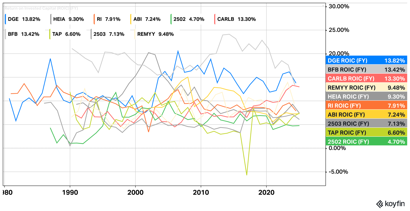 Because Diageo has quite high debt levels at the moment (another thing it has committed to improving), we will use ROIC for now. DGE, in blue, has consistently maintained higher returns than peers over time, especially since 2000, and currently leads the field. It has struggled, but so has the industry.