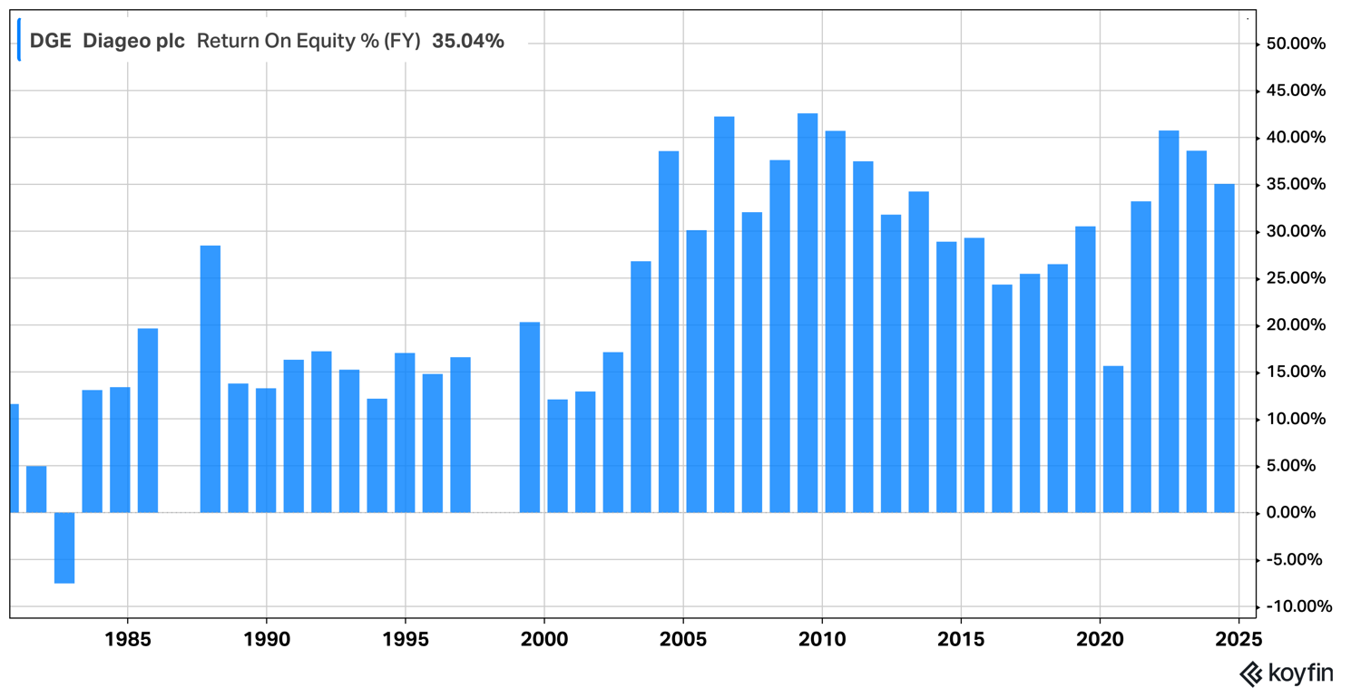 Inventory is a key factor, as many of their spirits benefit from a long ageing process. Diageo’s “total maturing inventories” increased more than 42% between 2020-2024, resulting in $7.8 billion of total aged inventory. This leaves a lot of company capital tied up in barrels of whisky and the like, but it’s a valuable asset. Many products risk becoming obsolete the longer they sit in inventory – for Diageo’s brown spirits it’s the opposite: aging increases the value. What this means is that an upstart competitor would take ten years before they could compete in the 10-year aged whisky category, and they wouldn’t know until then whether they’d even produced a good product.
