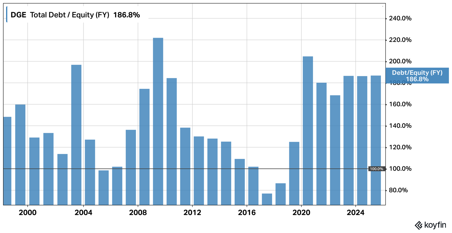 Diageo’s debt grew sharply on top of a rising trend during Covid. While it has pulled back a little since then, it remains at very high levels relative to equity, both for its own past and against alcohol company peers.