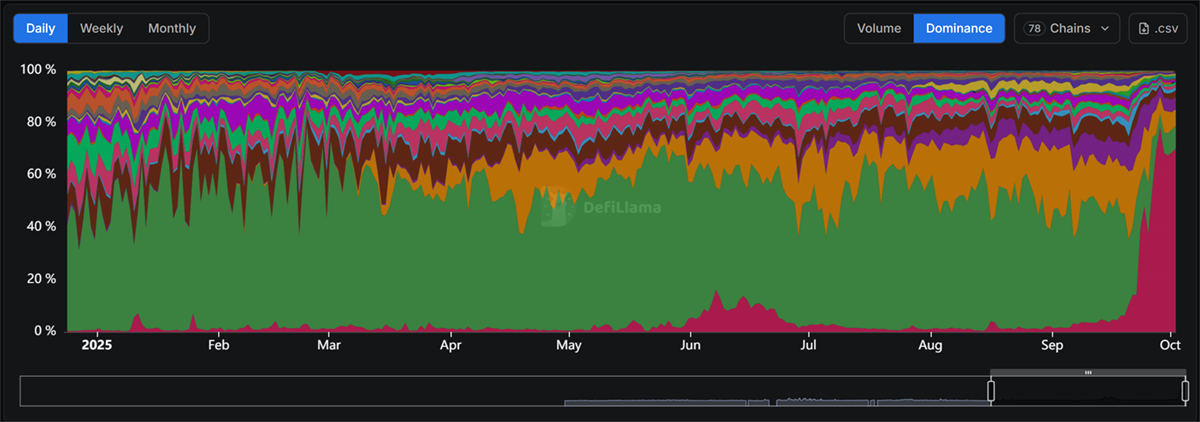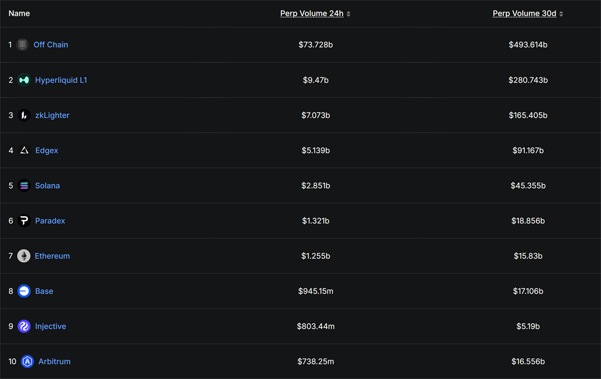 The second-largest chain is HyperLiquid L1, with $9.4bn in 24-hour volume, $70bn in 7-day volume, and $280bn across 30 days. This is followed by zkLighter, reporting $7bn over 7 days and $164bn across 30 days. While these numbers are impressive in their own right, they pale in comparison to Aster’s volumes, underscoring the extent to which it has consolidated market leadership in such a short span of time.