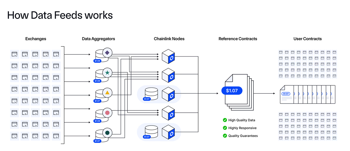 One of Chainlink’s most widely used services is its Market Data Feeds. These are decentralised price oracles that aggregate price information for assets like BTC, ETH, and stablecoins from multiple premium data providers. Each feed is powered by a network of independent nodes that pull data from different exchanges and APIs, aggregate it, and deliver a verified, tamper-proof price to the requesting smart contract.