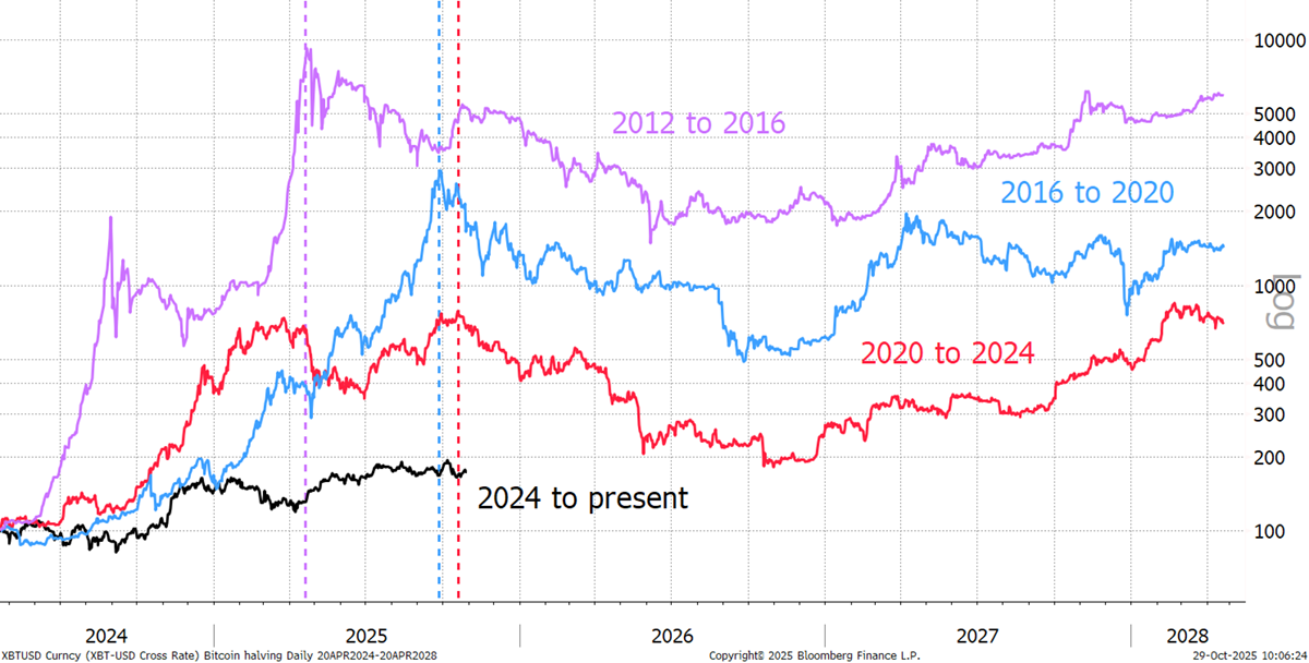Bitcoin’s supply growth is down to 0.8% p.a., which is a low number, or a stock-to-flow ratio of 119.5. Presumably, that makes halving events less relevant than they were in the past.