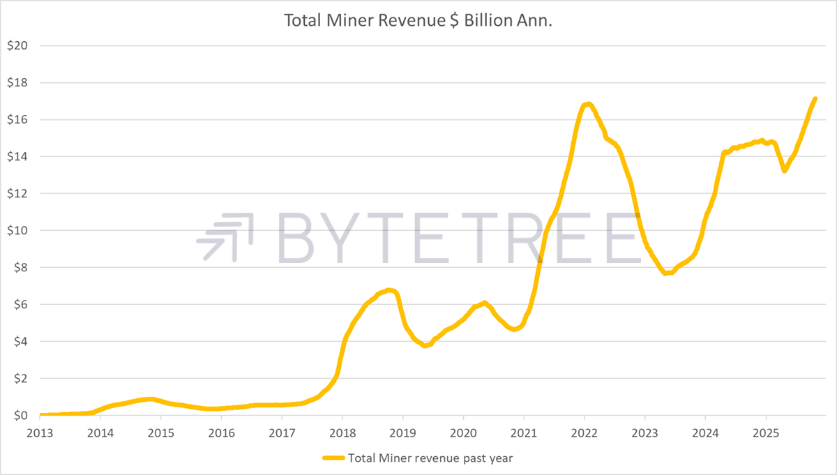 Against that, Bitcoin mining is a real cost, estimated to be $17.1 billion p.a.. For a sustained bull market, inflows must exceed that. ByteTree data shows that the ETFs alone have invested $35.3 billion in Bitcoin. There are also the treasury companies, so the conclusion must be that some OGs are selling.