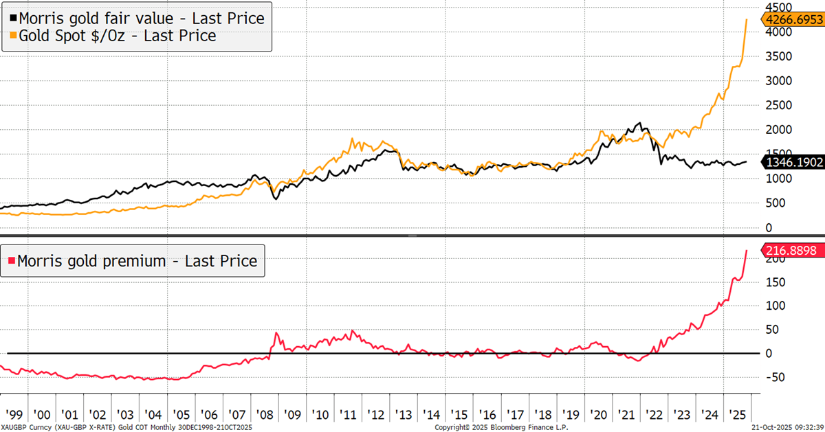 Since 2022, the price of gold has soared, and thankfully, we have held it. Prior to that, gold had sat comfortably in a regime whereby the price mirrored real interest rates. That is, gold would rise when rates fell below the expected future rate of inflation and fall when rates rose above inflation. The gold price moved inversely to real yields. I modelled this with a synthetic US Treasury Inflation Protected Security (TIPS).