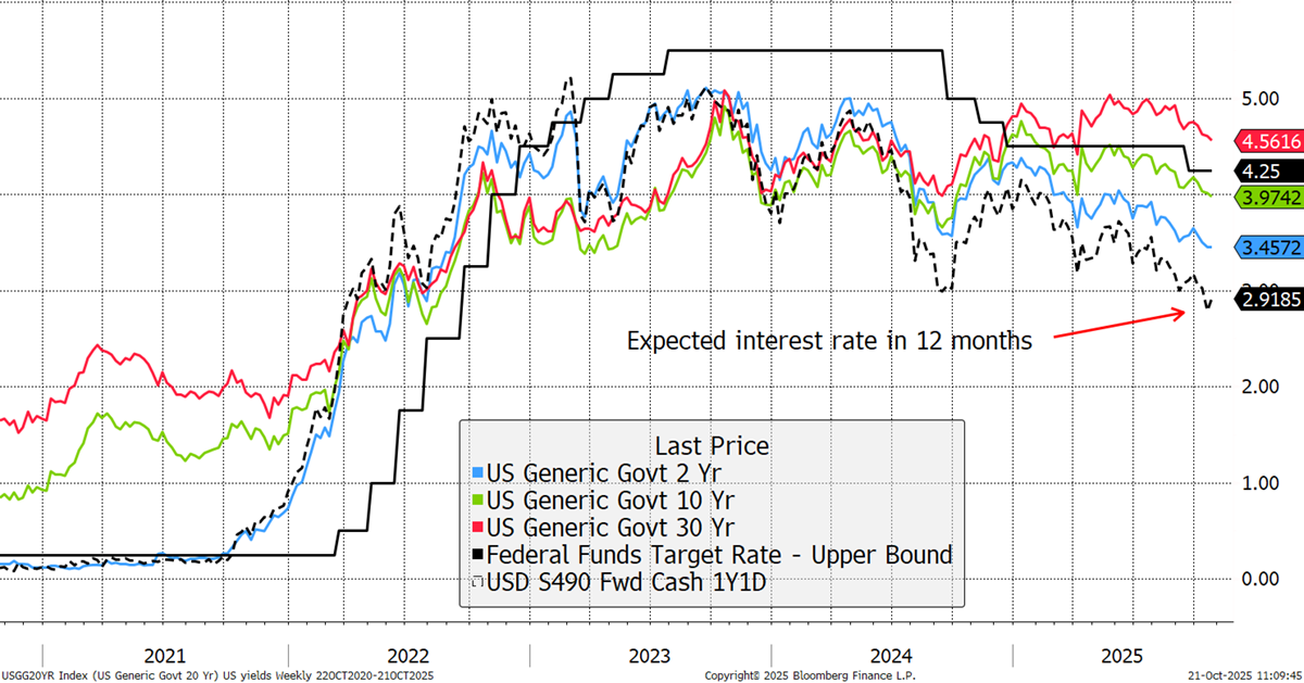 In late 2022, I flirted with TIPS, and the UK equivalent index-linked gilts (linkers), but it was too early. Bond yields are finally starting to fall, while inflation remains sticky. As illustrated in the chart below, the 2-year (blue), 10-year (green), and 30-year (red) bond yields in the US have been following interest rates (black) lower. The dotted black line shows where interest rates are expected to be this time next year. Just 2.9%, when the old tried and tested Taylor Rule, an old-school guide for policymakers, would suggest rates should be 6%.