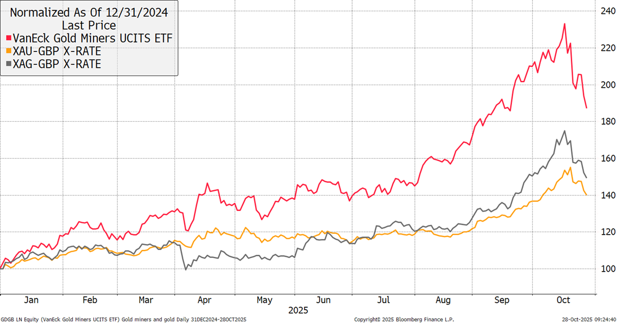 The biggest shake-up since I last wrote has been the correction in the price of gold. Peak to trough, it has fallen by 9.5%, which sounds harsh. A more upbeat way to frame it is that gold is only up by 2% in October, having given back some ground. Silver in October is flat, and the gold miners are down by 11%. In 2025, gold miners are up +90%, silver +50%, and gold +41% in GBP terms.