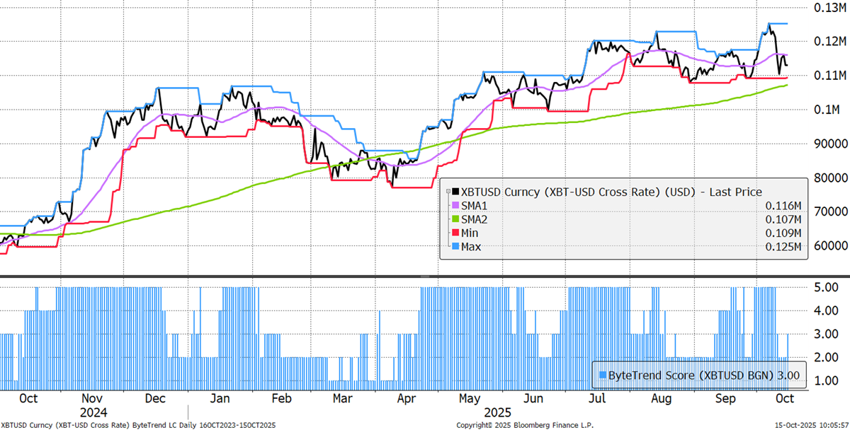 Bitcoin’s ByteTrend score drops to a 3, having visited 2 in recent days. Uptober has turned into Noctober, and the crowds are disappointed. Trump’s tweet on Friday triggered a liquidation event, as Ali will describe below.
