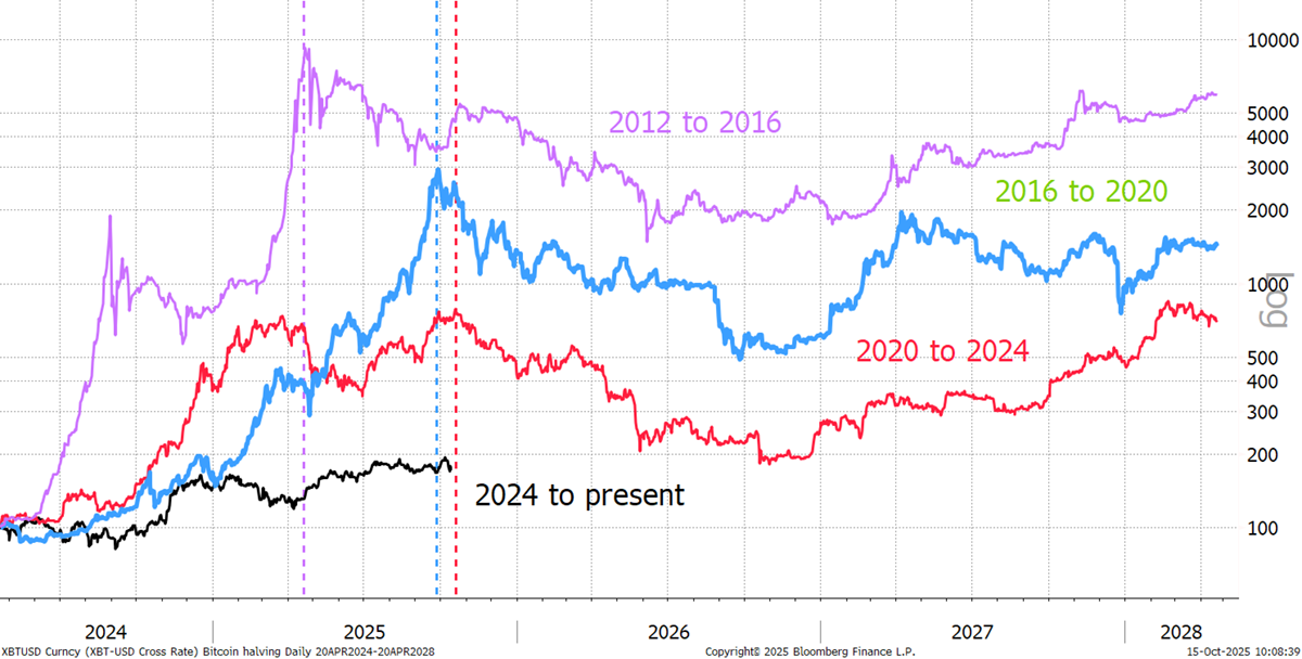 You have to wonder if the expected progress in Bitcoin has been pulled down by the cycle. Since the last halving in April 2024, we are close to the time it took to reach peaks in past cycles. The counterargument is that the cycle is dead, as the impact of halving is much less than it was in the past, and Bitcoin has become an institutional asset.