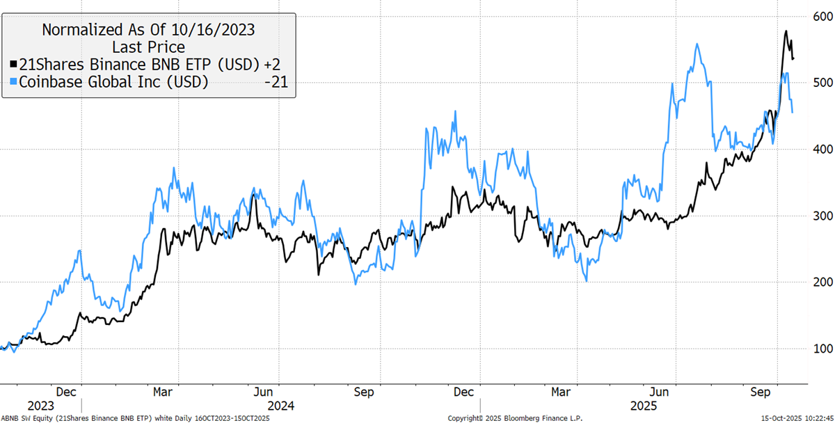 In the midst of the turmoil, the star of last week was Binance (BNB), crypto’s largest exchange. Although the BNB token is not an equity, it strikes us that it behaves like one. After all, returns are delivered through quarterly burns, whereby a portion of the profits is recycled into BNB. This reduces issuance, just like share buybacks. In other words, BNB is rather like Coinbase (COIN).