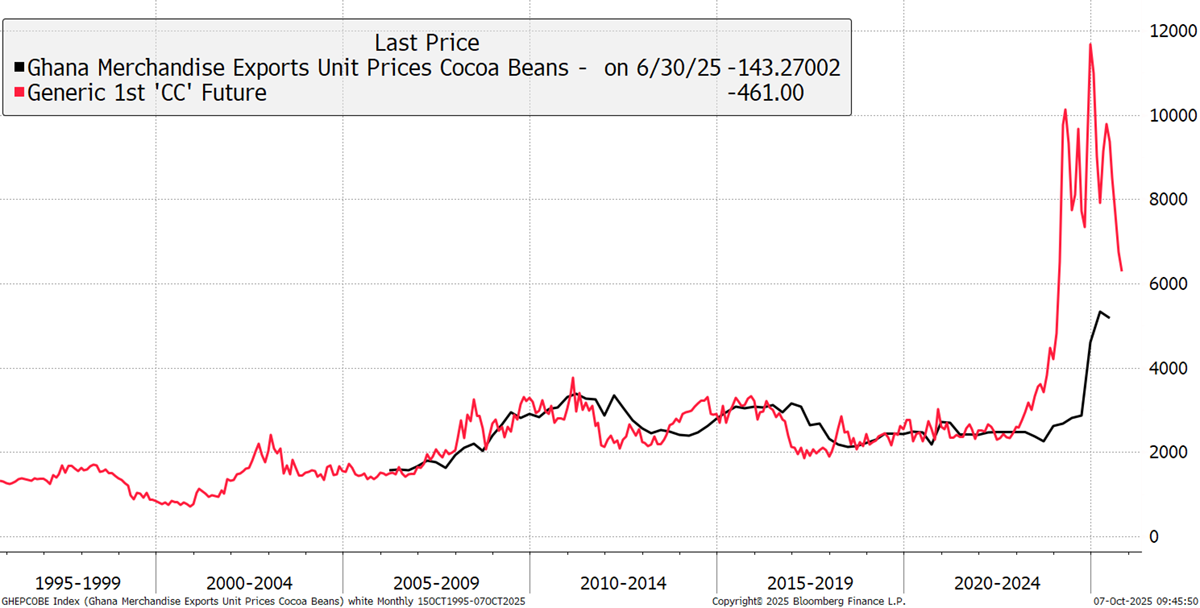 As I said, first we need to head off to West Africa, the centre of production, but we could also visit Cameroon, Nigeria, Brazil, Ecuador, Peru, or even Indonesia. We wish we’d gone a couple of years ago, because cocoa prices have soared. I show cocoa futures against the minimum farmgate price in Ghana.